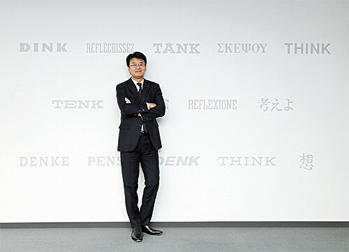 社是「考えよ」の各国語のボードを背に