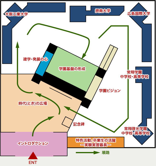 学園の戦前の旧教育体制からの流れを汲む常翔学園高等学校。2011年には常翔学園中学校を開校した。2007年に学園と連携協定を締結し2013年に学園設置学校として加わった常翔啓光学園中学校・高等学校。これらの学校の生徒活動などを展示しています。