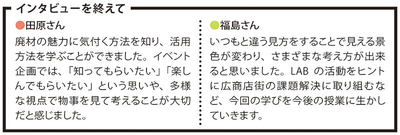 田原:絵を描いたり手芸をしたり、手を動かすことが好きです。大学の演習で昨秋、キャンパス周辺の商店街でフィールドワークを行い活性化に向けた課題を探りました。大月さんの取り組みを学び、解決の糸口にしたいと思っています。