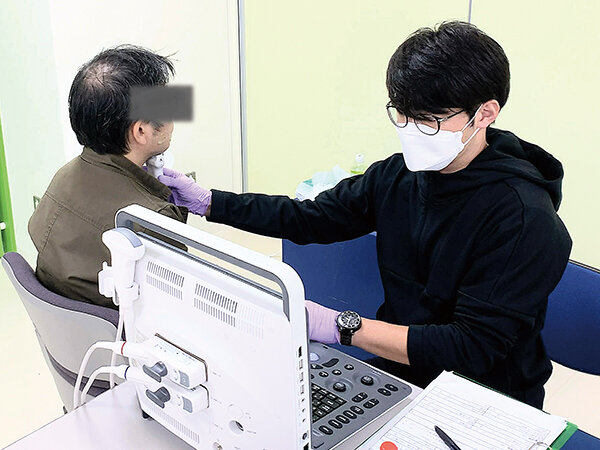 エコーを用いて嚥下筋の筋量を測定する福岡教授