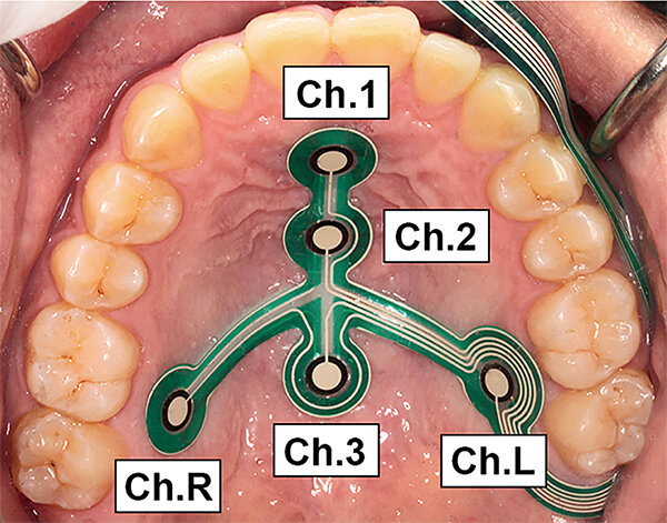 口蓋部に取り付けた舌圧センサーシート。5点の感圧部で舌圧最大値や接触時間を計測する