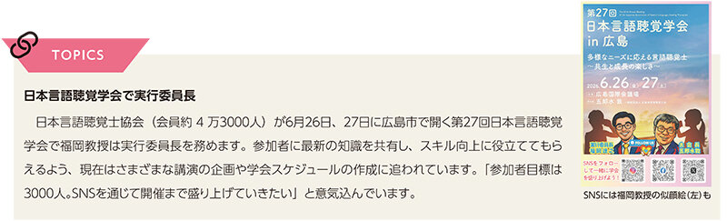 大学時代に福岡教授は言語聴覚士という国家資格ができることを知り、興味を持ちました。卒業後、専門学校に進んで資格を取り、大学病院に就職。難聴の子供に言語指導やリハビリを行うことをイメージしていました。しかし、現場で接したのは、口腔や嚥下の機能が落ちて食べられなくなった高齢患者がほとんどでした。「こんなにも食べることに苦労している人がいるとは」。驚くとともに、「目の前の困っている人をなんとか救いたい。もっと嚥下の知識をつけなければ」と、働く傍ら大学院で学ぶ道を選びました。「研究して解明して発表する。気が付いたら研究にのめりこんでいました」