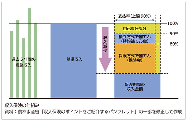 もう一つは「収入保険」です。全ての農産物を対象に収入減少を補償します。仮に、収入がゼロになったとしても、基準収入の81%が補てんされるため、農業経営に必要な費用はほぼ全額賄うことができます。幅広く補償する優れた制度ですが、保険金の支払いは収穫年の翌年の確定申告後と、支払いまで時間がかかるのがデメリットです。