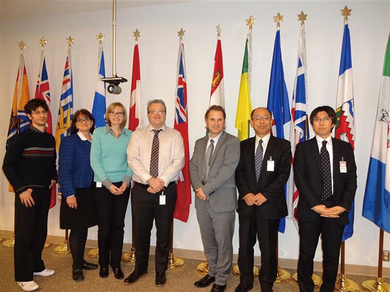 カナダ農業・農産食料省でのヒアリング後の集合写真。背後にあるのは各州の旗。農業政策については、連邦政府と州政府が同等の権限を有しており、両者で協定を結んで取り組んでいる(右から2人目が吉井教授)=2017年