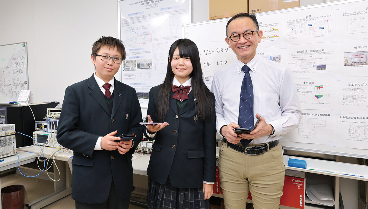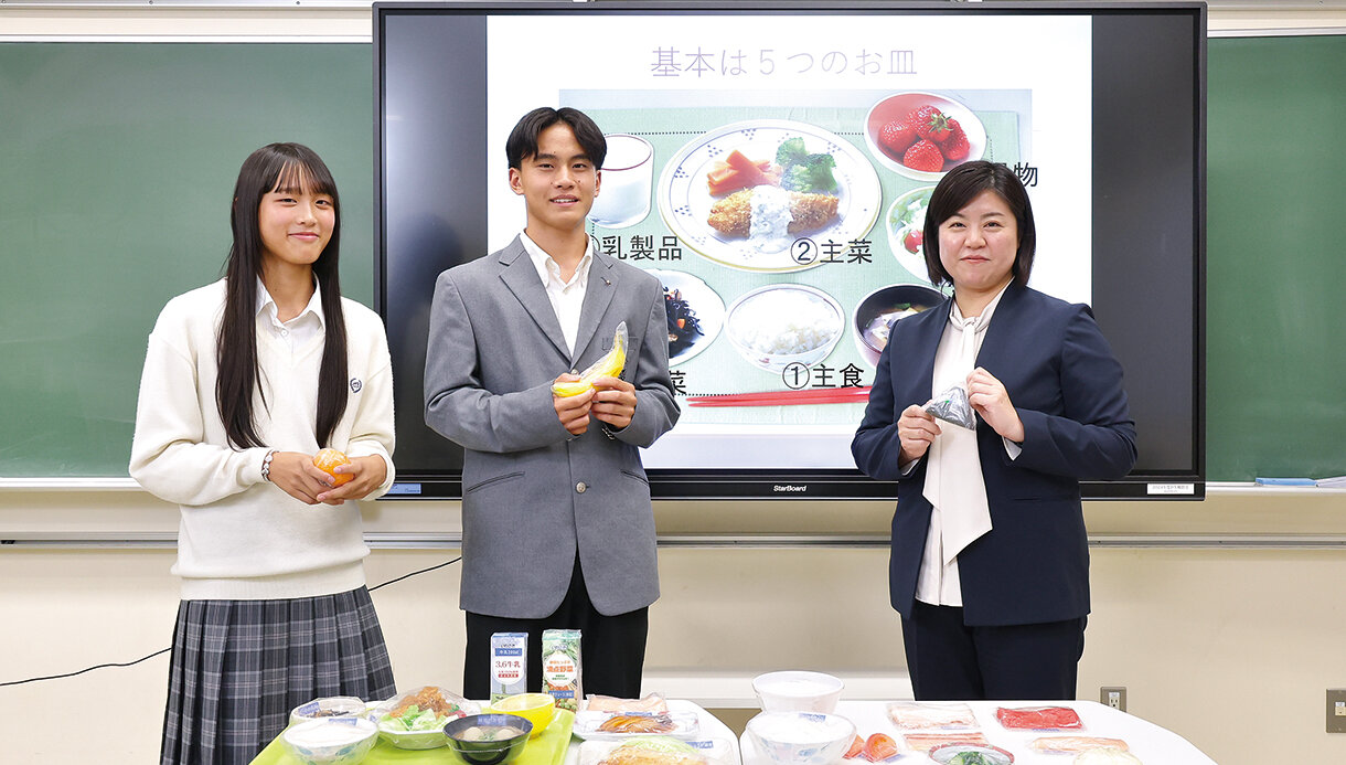 3大学2中高を設置する本学園のスケールメリットを生かして、高校生が大学の先生から学ぶ「教えて先生」。今回は、常翔啓光学園高で陸上部に所属する1年生、上原梨花さんと橋爪翔さんが、広島国際大医療栄養学科の中村亜紀教授に運動と食事の関係について教わりました。