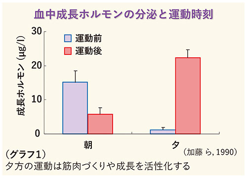 中村:ヒトの体温は午後3時ごろに最も高くなり、運動能力・酸素消費量・肺活量のいずれも夕方がピークになります。血液中の成長ホルモンも、朝より夕方に運動する方が大きく増えるので、夕方の運動は体力や筋力を向上させます(グラフ1)。