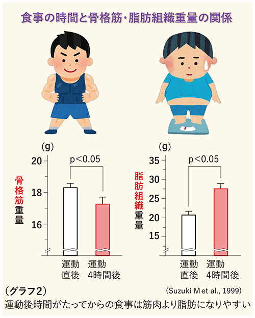 中村:運動後は、できるだけ早く食事を摂りましょう。筋肉にはエネルギー源となるグリコーゲンが貯蔵されていますが、運動により消費され、不足した状態が長引くと疲労から回復するまで時間がかかります。直後にエネルギー補給をすることでグリコーゲンや筋タンパク質を効率よく増やすことができます。運動後の食事は、30分から1時間以内が「ゴールデンタイム」と呼ばれるほどです。時間が経過してから食べると、筋肉より脂肪がつきやすくなります(グラフ2)。