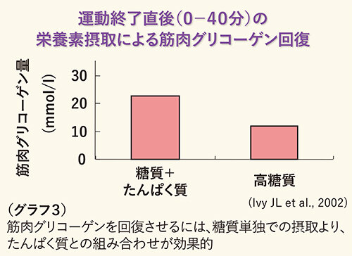 中村:練習後に軽食を食べることはできますか? 鮭やツナのおにぎりや肉まんなど、軽く食べられるものを用意しておくといいですよ。炭水化物(糖質)だけよりも、炭水化物(糖質)とたんぱく質の組み合わせがグリコーゲンの回復や筋タンパク質の合成に効果的です(グラフ3)。