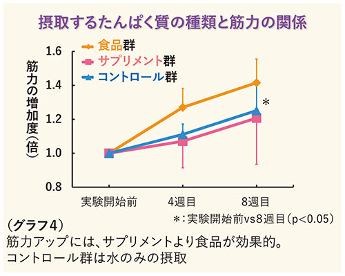 中村:高校生はよほどの運動量でない限り、食事のたんぱく質で十分だと思います。たんぱく質は摂り過ぎると体脂肪として蓄積することもあります。また、たんぱく質は、サプリメントより食事から摂取した方が、筋力トレーニングに効果が出るというデータもあります(グラフ4)。そして、一度にたくさん摂るより、3食均等に食べる方が効果的です。朝ごはんにもぜひ、たんぱく質を摂り入れましょう。普段は何を食べていますか?