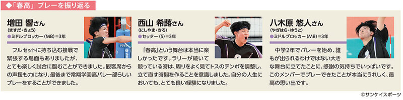 JVA第78回全日本バレーボール高等学校選手権大会(春高バレー)に初出場を果たした常翔学園高男子バレーボール部。大阪府予選ではノーシードから勝ち上がり、春高バレーの舞台では愛工大名電高(愛知)を相手にフルセットの激闘を見せました。第1セットを先制しますが、続く第2・3セットを取られ、惜しくも敗退。大会を振り返り、寺田想主将(3年)や澤村大介監督、代表選手ら(同)に話を聞きました。