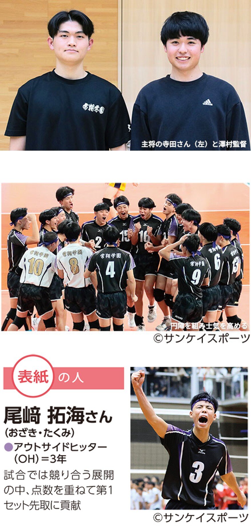 澤村:選手が言いたい事を言いやすい環境を作るために、まずは自分から積極的に話しかけることを意識してきました。選手らは互いに支え合い、ここまでやってきました。常翔学園高バレー部で得た経験や学びを今後にも生かしてくれたらうれしいです。